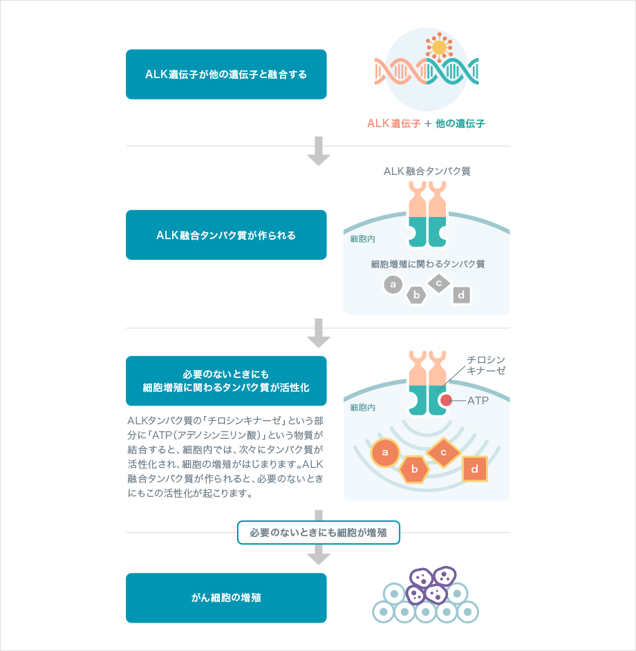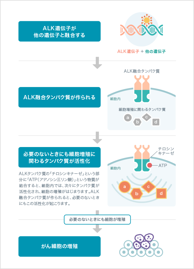 ALK融合遺伝子からALK融合タンパク質が作られると、必要のないときにも細胞が増殖し、がんが発生しやすくなると考えられています。