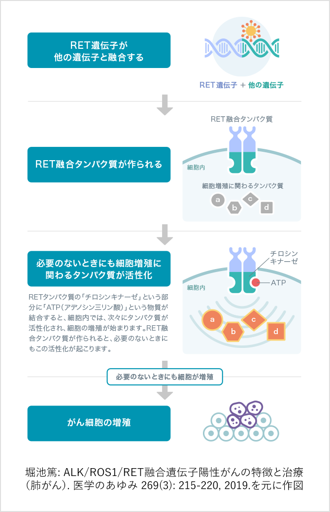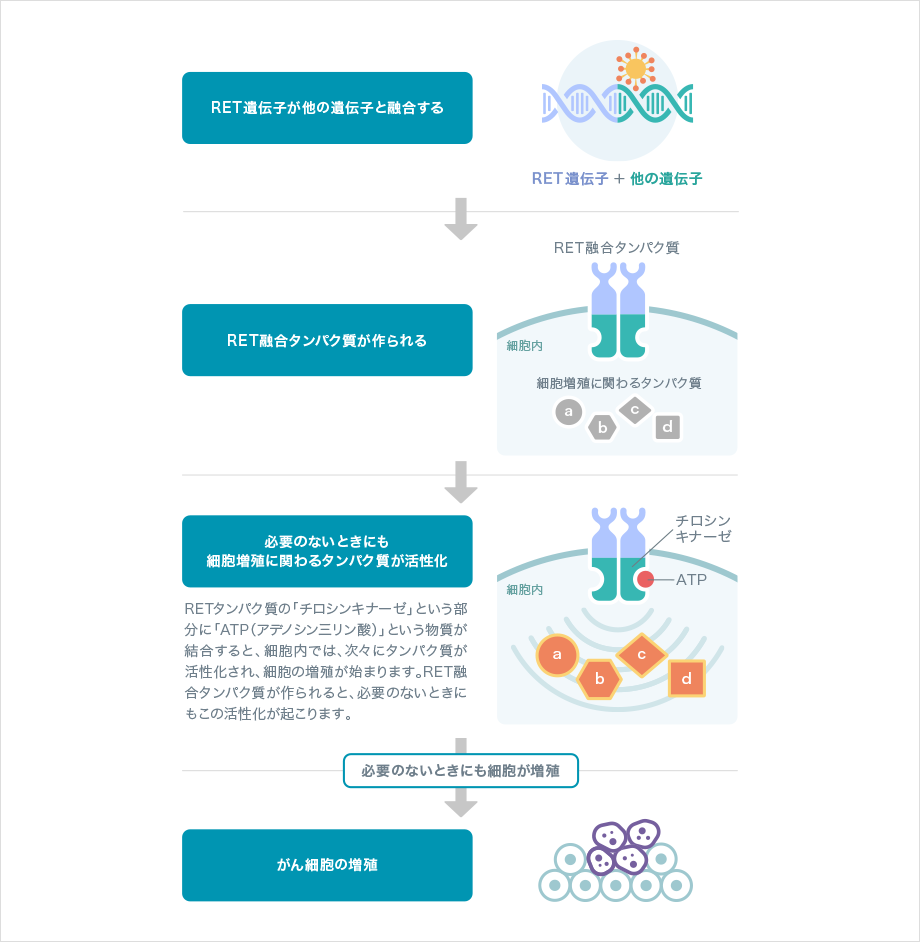 RET遺伝子が他の遺伝子と融合したRET融合遺伝子からRET融合タンパク質が作られると、必要のないときにも細胞が増殖し、がんが発生しやすくなると考えられています*1。