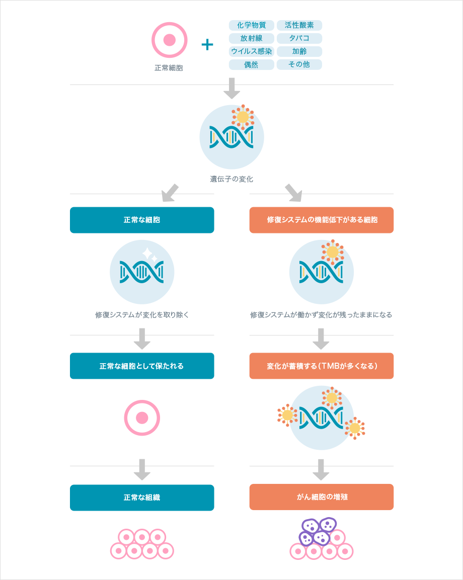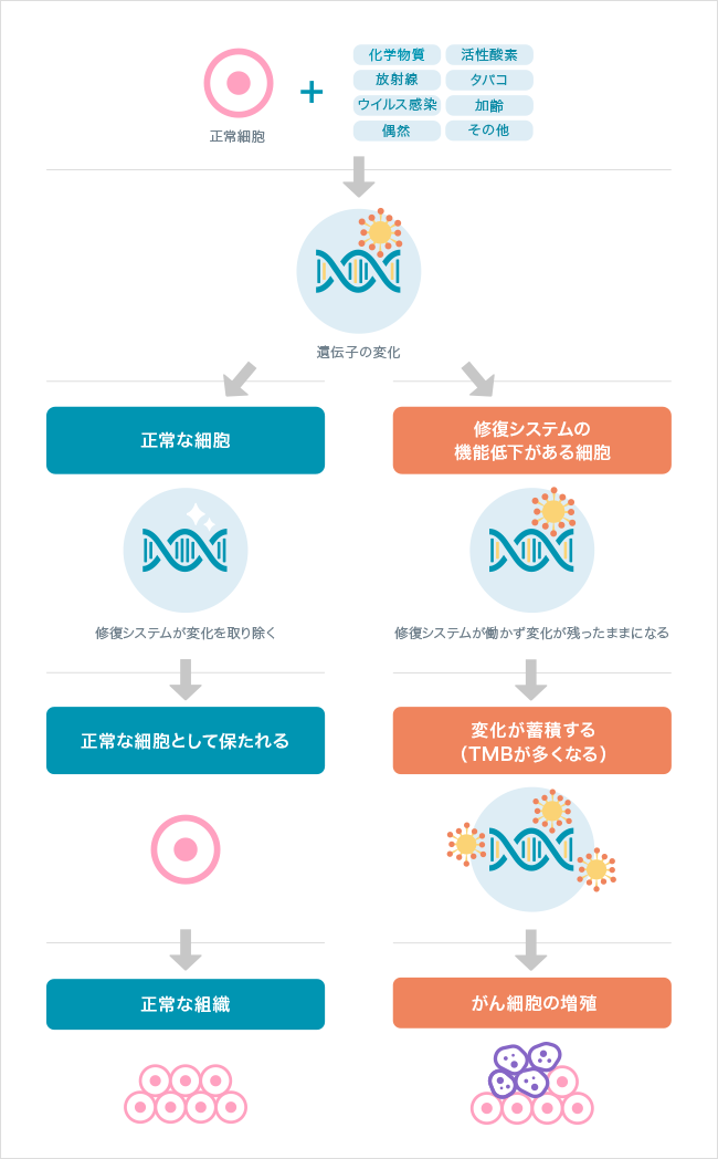 もともと、私たちの体には遺伝子が変化するとその変化を取り除く機能(修復システム)が備わっていて、細胞が正常に機能するようにできています。TMBが多いということは、修復システムがうまく機能していない状態であり、がんが発生しやすい状態だと考えられています*1*2。